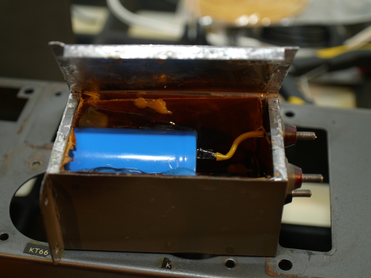 Beim Ersatz von C2 und C3 ist zu beachten, dass die originalen Kondensatoren eine metallische Ummantelung aufweisen und durch eine Schelle mit dem Gehäuse verbunden sind.